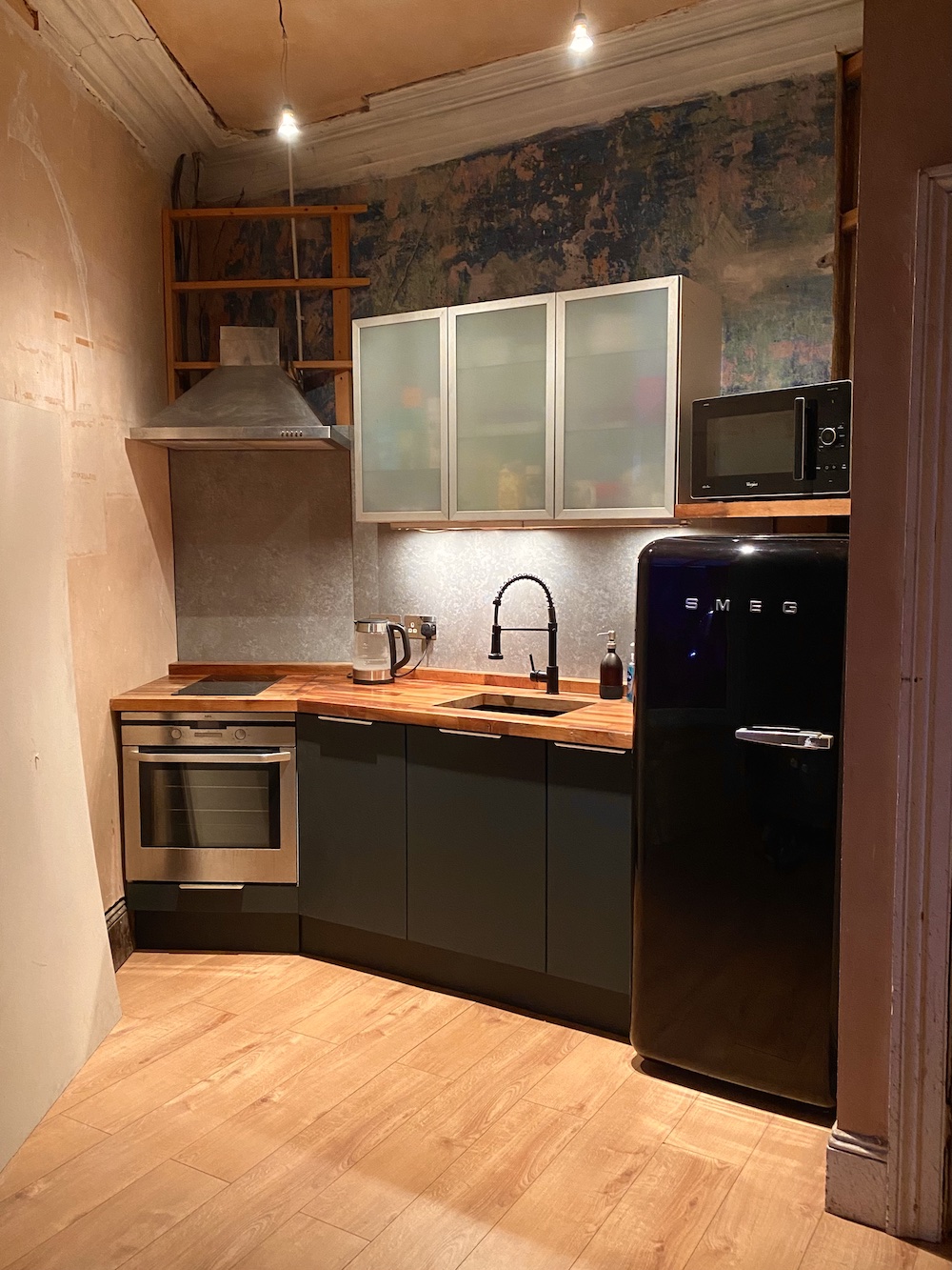 The accommodation includes a kitchen, bathroom and two bedrooms (2 x double beds + 1 single bed).